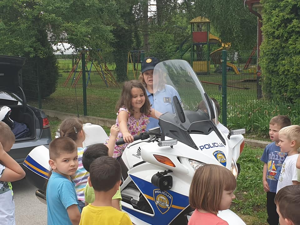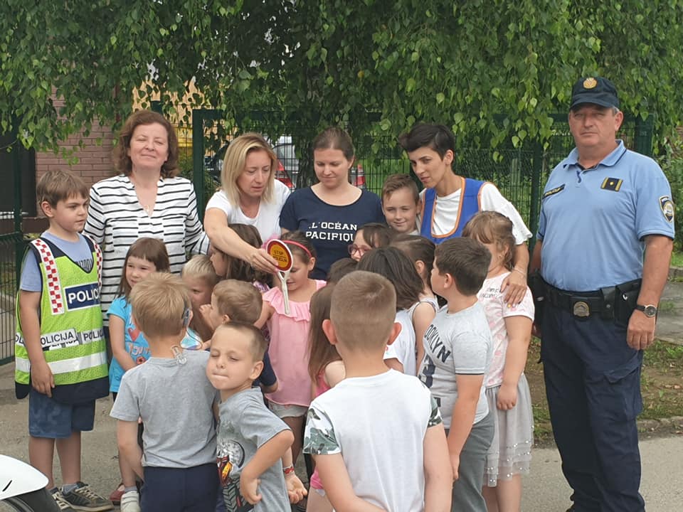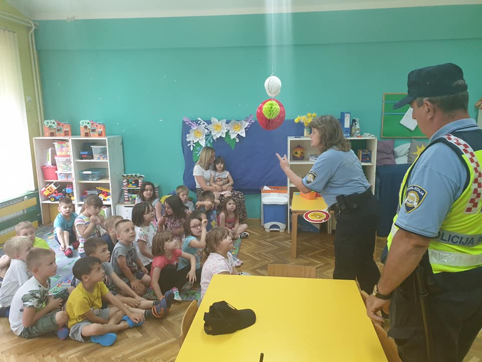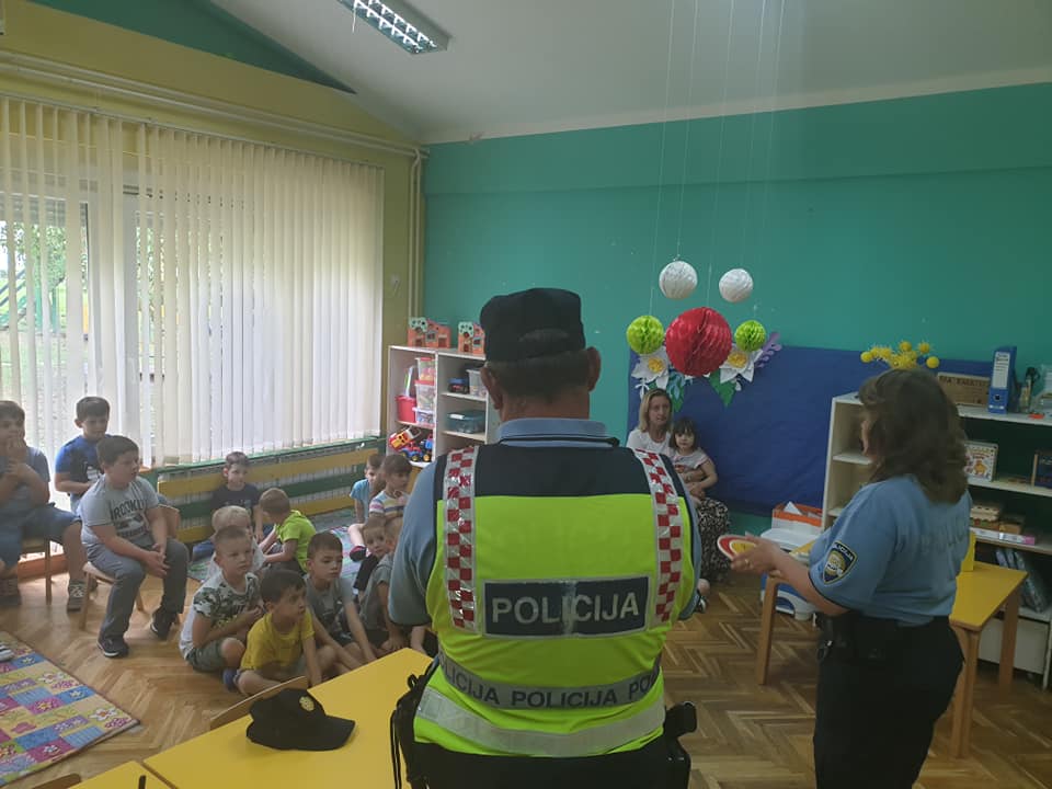 Djelatnici policijske postaje Kutina sa načelnicima Predrag Fitnić i Alen Bilanđija došli su djeci predškolskog uzrasta pojasniti kako se treba ponašati u prometu i kako se paziti raznih opasnosti.