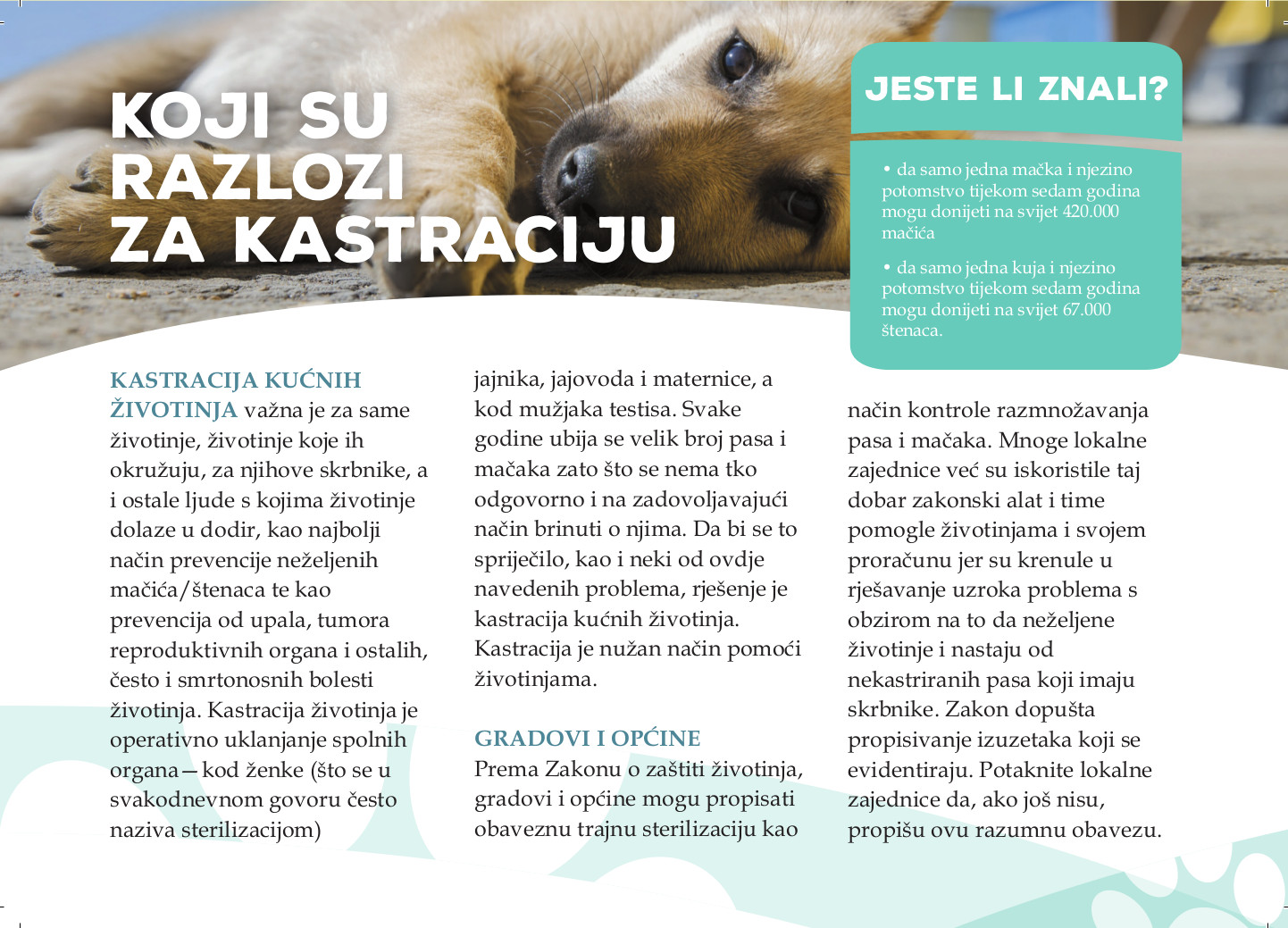 S tim u vezi, želimo Vas potaknuti da i vaša lokalna zajednica obilježi ovaj međunarodni datum. Naime, upravo kastracija pasa i mačaka može najviše pomoći u provedbi Zakona o zaštiti životinja i rješavanju uzroka problema, pa na kraju dovesti i do smanjenja financijskih izdataka koje trebate izdvajati zbog neodgovornosti građana.