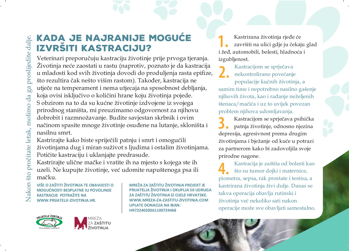 - Promocijom kastracije i Svjetskog dana kastracije i vaših programa i mjera vezanih za kontrolu razmnožavanja životinja preko letaka priloženih uz uplatnice komunalne naknade, plakata, lokalnih medija, informativnih štandova i na druge načine.