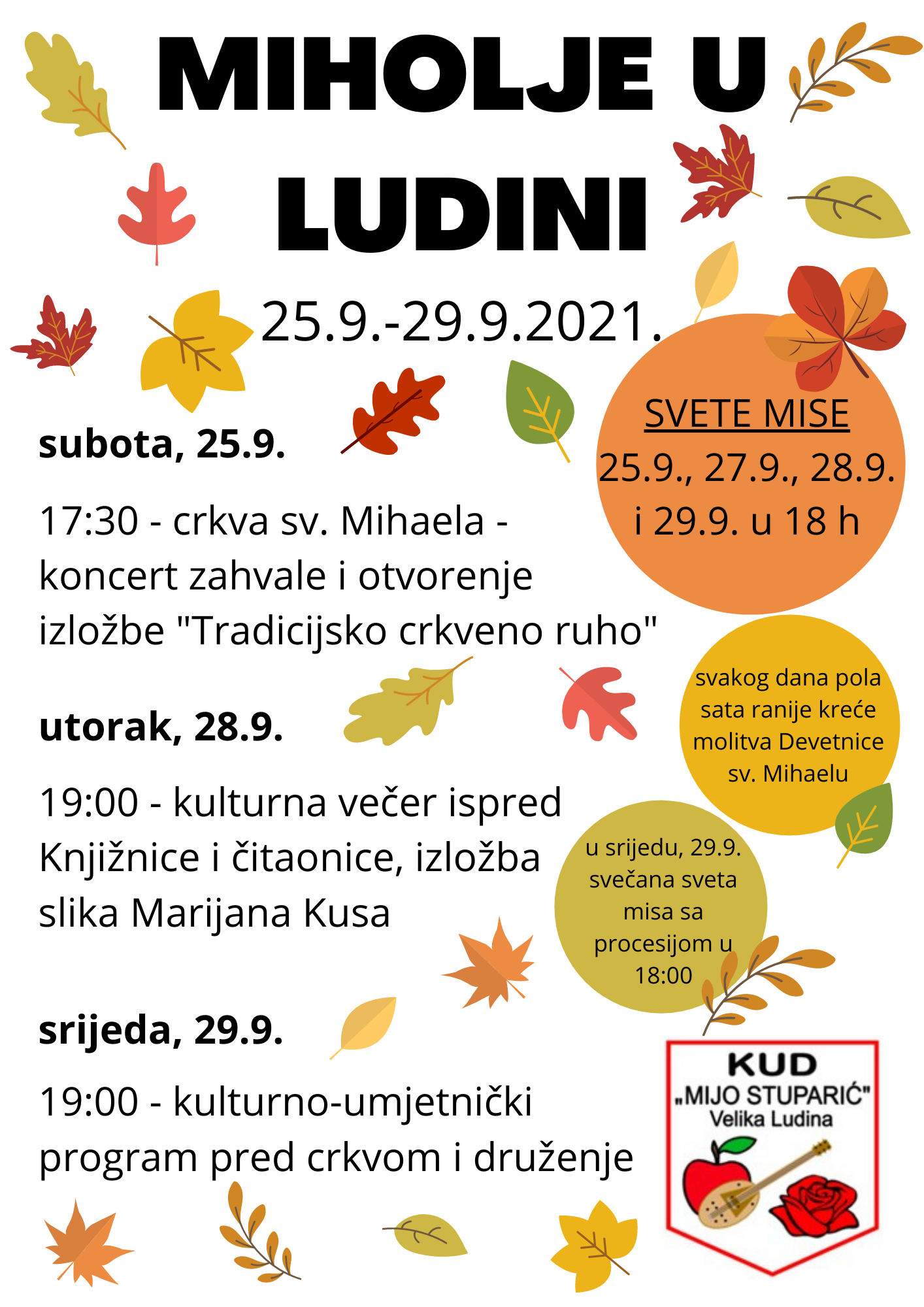 Povodom Dana župe Ludina, odnosno blagdana svetog Mihaela Arkanđela, Kulturno-umjetničko društvo “Mijo Stuparić“ u suradnji s općinom, Knjižnicom i čitaonicom te vodstvom Župe održat će manifestaciju „Miholje u Ludini“. Uz pripremu programa koji će biti sakralnog i kulturnog karaktera, trenutno se uređuje i uži centar mjesta te crkva.